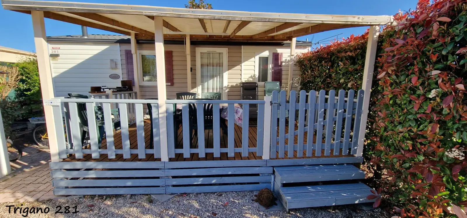 Mobil-home TOUT CONFORT 29m² idéal 4 personnes, avec terrasse en bois couverte, avec climatisation réversible et composé de 2 chambres équipées de rideaux occultant, une avec grand lit 1.40×1.90 et l’autre 2 lits 0.80×1.90. Possibilité de rapprocher les 2 lits pour en faire un grand. Une salle de bains avec douche un WC séparé. Un salon avec canapé d’angle, TV écran plat, une cuisine toute équipée plaque de cuisson vitro céramique, micro-ondes, bouilloir, grand frigo avec congélateur, machine à laver, et un grand cellier pour rangements. Machine à café *** SUNSEO *** prévoir les dosettes (disponible aussi à la sortie du camping au supermarché). Nécessaire de nettoyage + 1 aspirateur sans fil. Terrasse couverte avec salon de jardin (table + 4 fauteuils et 2 chaises) et 2 transats + 1 plancha électrique.