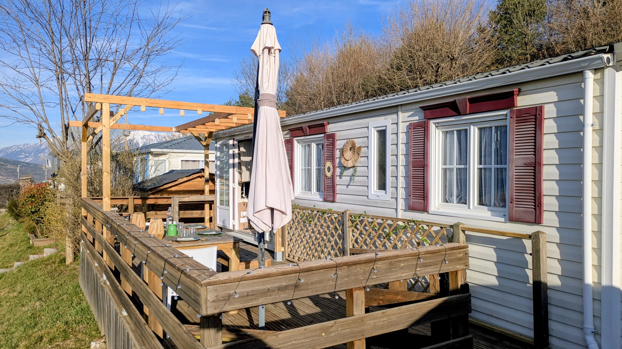 Location d’un Mobile – Home au bord du lac de Serre Ponçon dans la région Hautes Alpes/Alpes de Hautes Provence » 🏞️ où tu trouveras de nombreuses activités nautiques 🚣🏻♀️🏄🏼🏊🏼🏖️ « des plages aménagées, du kayak, du wingfoil, du pédalo, des jeux aquatiques, de la voile… »ainsi que des activités en montagne 🧗🏼 »randonnées autour du lac, escalade, canyoning, via ferrata,… » avec le magnifique village d’Embrun situé à 10 minutes en voiture ainsi que Gap à 30 minutes.
